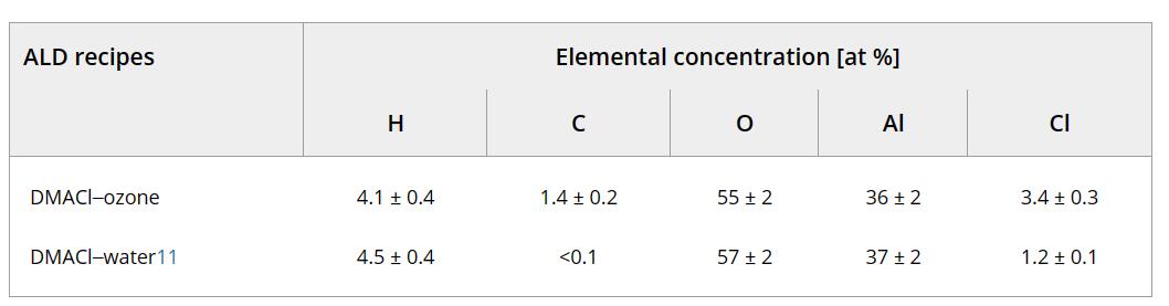 表1 DMACl -臭氧和DMACl -水ALD中大部分Al2O3薄膜中元素濃度的比較。在200℃下沉積400個(gè)ALD循環(huán)。