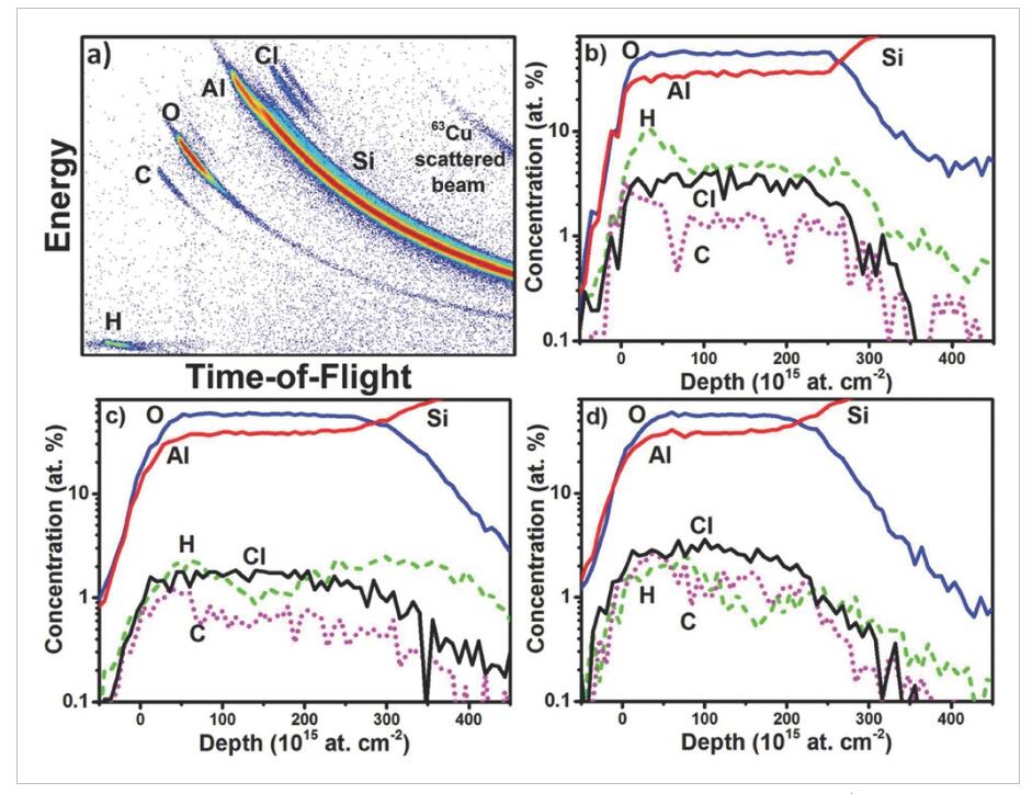 圖3:在ToF-ERDA測(cè)量中,可以通過(guò)測(cè)量每個(gè)反沖原子的飛行時(shí)間和能量來(lái)分離不同的質(zhì)量。Al2O3膜的元素深度分布:b)用7秒臭氧脈沖時(shí)間沉積時(shí),c)用20秒臭氧脈沖LT+HT處理后,以及d)用7 s臭氧脈沖LT+T處理后。a) 與(c)中的深度剖面相對(duì)應(yīng)的直方圖。該膜在200°C下以400次ALD循環(huán)沉積。注:由于直方圖中Al和Si在Si/Al2O3界面處的截面重疊,因此將Al和Si的深度分布繪制為一體。