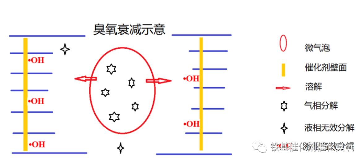 臭氧液相溶解與衰減:影響因素相互交叉,比較復(fù)雜。如紊動,既可增強(qiáng)溶解、又可強(qiáng)化衰減,而衰減包括有效分解和無解分解。三過程對反應(yīng)器工況影響巨大,簡單地想象一下:若溶解慢,大部分臭氧被氣泡攜帶,則在池上部的分布多;若溶解快,大部分臭氧被水流攜帶,若氣液逆向流,則在池下部的分布多。若無效分解比有效分解慢得多,催化劑填料高度小些也問題不大;若兩種分解速率差不多,催化劑填料不僅高度要大,而且在池中位置影響很大。因此,反應(yīng)器的優(yōu)化,包括:臭氧布?xì)馄餍问剑馀荽笮。⑹欠駳庖耗嫦蛄鳌⒋呋瘎﹨^(qū)域高度和位置等,都依賴于臭氧溶解與分解動力學(xué)的建立。