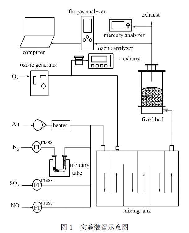 實驗系統(tǒng)示意圖見圖1,主要由配氣系統(tǒng)、氣體混合罐、吸附床和檢測系統(tǒng)組成。配氣系統(tǒng):空壓機壓縮鼓出的空氣通過轉子流量計控制,使用管式爐進行預熱調溫,使用質量流量控制器控制N2、NO 和SO2 氣體,其中,N2 氣體用于吹脫汞管中汞蒸氣。使用溫度測試儀測定煙氣溫度。O2與臭氧發(fā)生器相連,產(chǎn)生一定濃度的臭氧氣體,通過其自帶的流量計控制流量并注入混合罐中與煙氣混合。