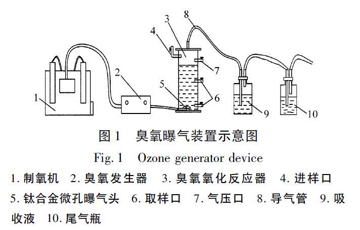 03質(zhì)量濃度38~60mg/L,出氣經(jīng)過置于反應(yīng)器底部的鈦合金微孔曝氣頭進(jìn)入臭氧氧化反應(yīng)器,以20g/L的硼酸為吸收液,啟動臭氧發(fā)生器后淀粉碘化鉀試劑開始變藍(lán)時計時,臭氧尾氣由碘化鉀吸收后排放。