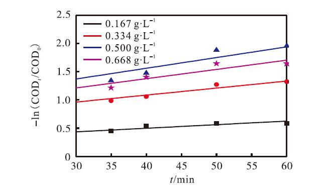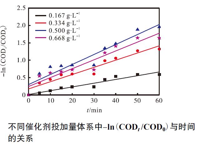 圖3 不同催化劑投加量體系中-ln(CODt /COD0)與時間的關(guān)系