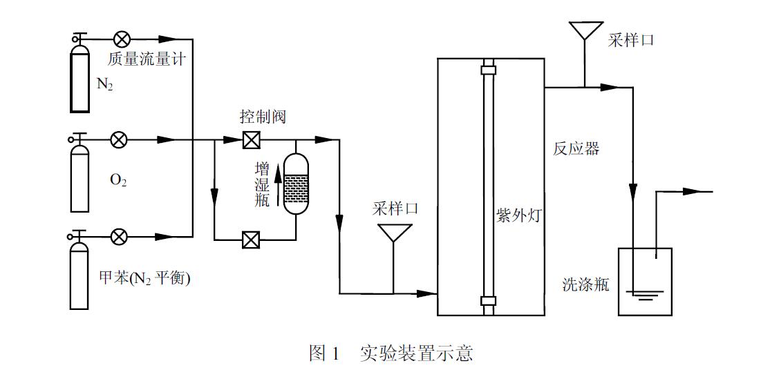甲苯是一種導(dǎo)致大氣光化學(xué)污染以及對(duì)人體健康造成毒害作用的典型揮發(fā)性有機(jī)物,城市大氣環(huán)境中甲苯濃度約為幾到幾十個(gè)μg/m3.機(jī)動(dòng)車排放、工業(yè)過程、建筑涂裝、餐飲油煙等均是大氣中甲苯的來(lái)源.此外,甲苯作為室內(nèi)污染物之一,長(zhǎng)期暴露容易引發(fā)頭痛、神經(jīng)衰弱等疾病.近年來(lái),利用紫外光氧化和紫外光催化氧化去除毒性氣態(tài)VOCs 成為研究熱點(diǎn).紫外光和臭氧協(xié)同作用即UV/O3 體系能有效地去除氣態(tài)揮發(fā)性有機(jī)物,但需要外加的O3來(lái)源補(bǔ)充體系中不能自主產(chǎn)生臭氧.紫外光和催化劑的協(xié)同作用能夠有效地去除VOCs,但降解過程中產(chǎn)生的中間產(chǎn)物容易導(dǎo)致催化劑活性降低.國(guó)內(nèi)采用紫外光氧化及紫外光光催化降解氣態(tài)甲苯的研究中,使用的紫外光波長(zhǎng)也均是254nm 或者365nm.使用低于254nm 的紫外光氧化氣態(tài)苯系物的研究相對(duì)較少.相對(duì)于254nm 紫外光,185nm 紫外光具有更高的能量,水和氧氣分子在短波長(zhǎng)紫外光輻射下,可產(chǎn)生⋅OH 和臭氧.