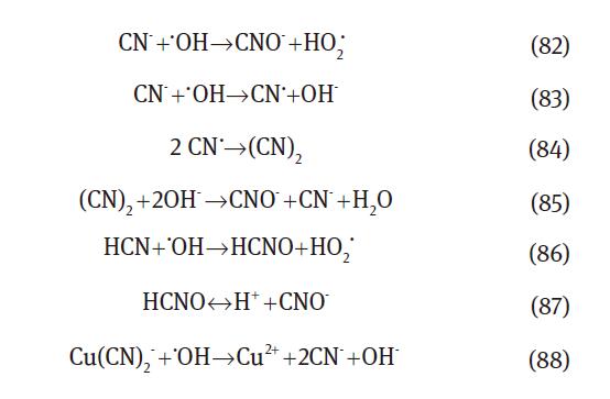 廢水中的氰化物由于具有毒性作用而成為重要的問題,通常以氰化氫,陰離子和各種氰化物配合物的形式存在。氣相或水相中的游離氰化物離子(包括氰化物陰離子和氰化氫)是 很劇毒的形式(Dash等,2009)。由于氰化物與臭氧的強(qiáng)烈反應(yīng)性和氰化物的完全消除而不會產(chǎn)生不希望的副產(chǎn)物,因此各種來源的氰化物臭氧化前景廣闊。氰化物臭氧化的主要產(chǎn)物是氰酸鹽,可通過水解或臭氧化過程進(jìn)一步降解,但是反應(yīng)速度比氰化物的氧化速度慢(Mert等人,2014)。相比之下,臭氧分解產(chǎn)生的˙OH氧化氰化物的方法是通過以下兩種途徑生產(chǎn)危害較小的中間體CNO [Eq.(82)和Eqs.(83-85)](Gurol and Bremen 1985a)。盡管氰化氫與臭氧的反應(yīng)性較弱,但它很容易被˙OH介導(dǎo)的反應(yīng)降解[Eqs(86–87)]。