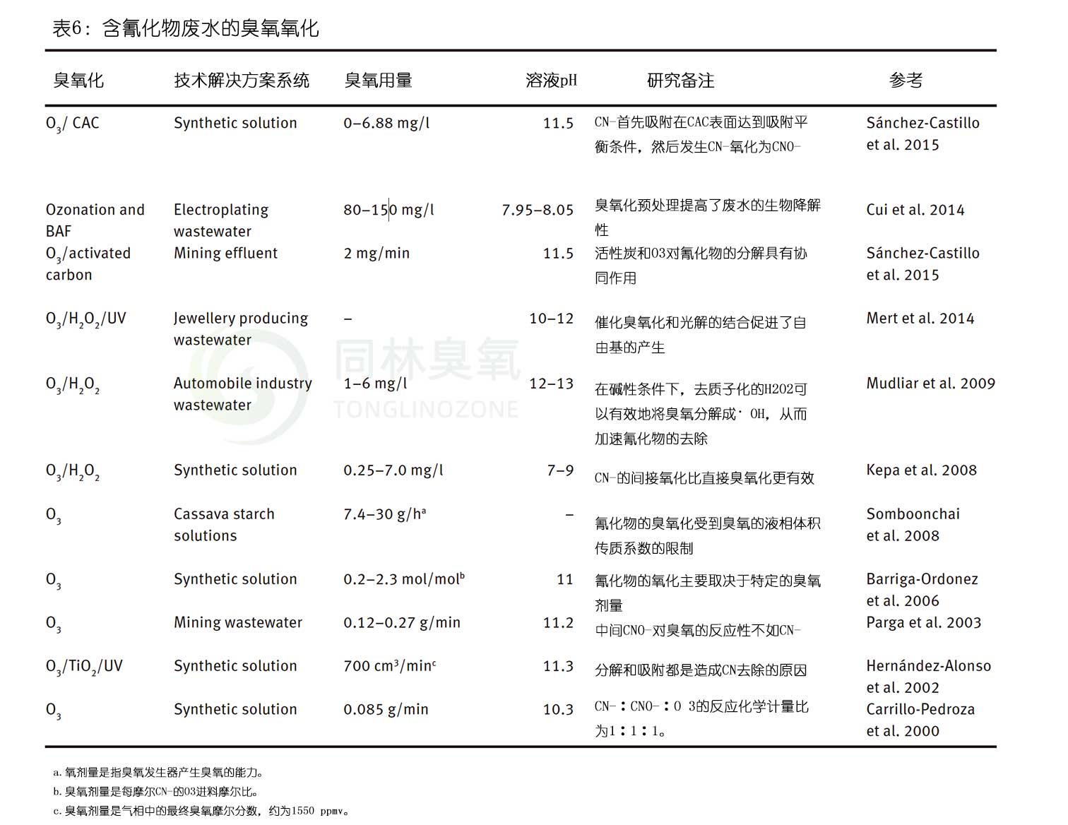 表6總結(jié)了通過催化和非催化臭氧化技術(shù)減少氰化物的研究活動。