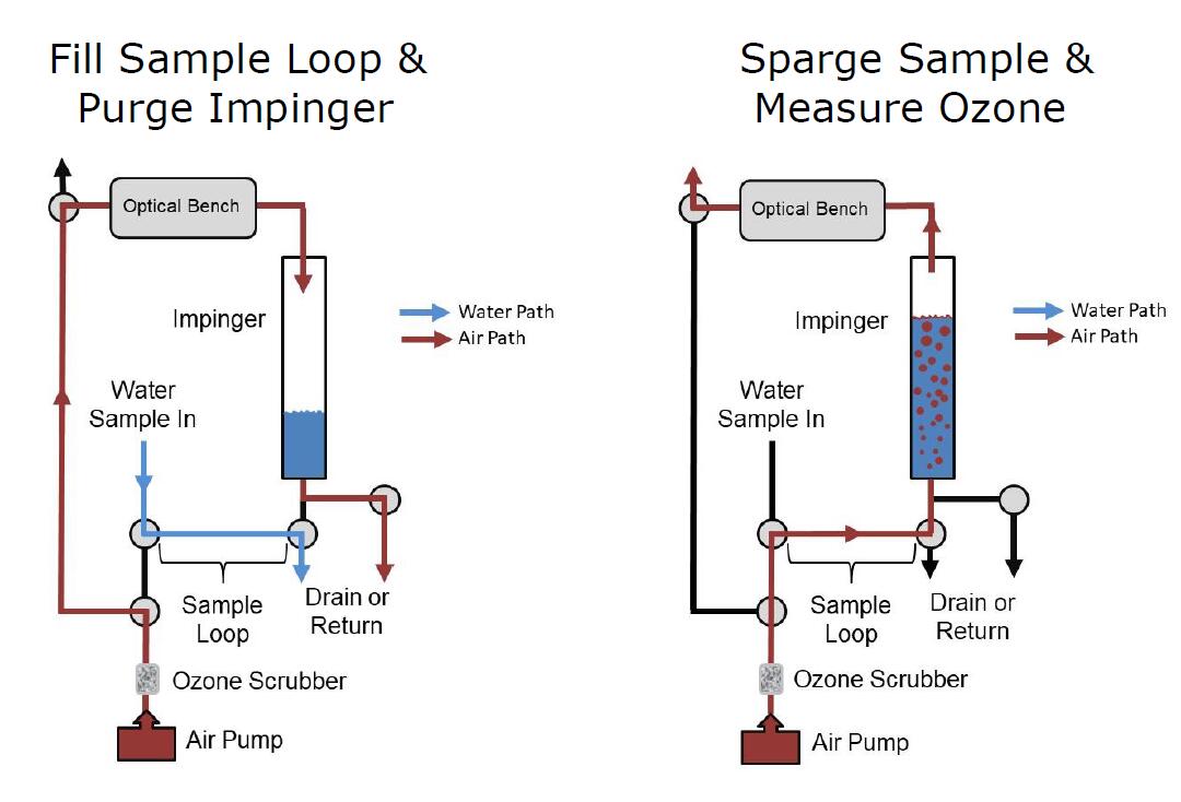 圖 1是水臭氧監(jiān)測儀的示意圖。四個(gè) 2 通閥和一個(gè) 1 通閥引導(dǎo)空氣和水流通過設(shè)備。測量溶解臭氧的過程包括兩個(gè)步驟。在第一步(圖 1 的左圖)中,樣品環(huán)中充滿了來自待分析水源的加壓水流,內(nèi)部空氣泵對撞擊器加壓以清空前一個(gè)樣品中的臭氧消耗水.在第二步中,改變閥門狀態(tài),使來自空氣泵/洗滌器的不含臭氧的空氣都將約 2 mL 水樣推入沖擊器并噴射樣品,富含臭氧的空氣通過光具座,其中臭氧被測量。每個(gè)步驟大約需要 5 秒,每 10 秒報(bào)告一次新的臭氧測量值。