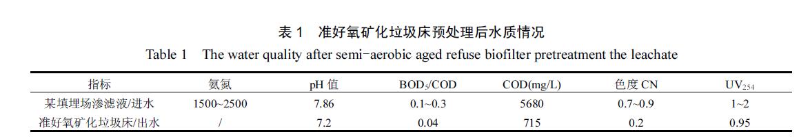 垃圾滲濾液取自中國西部某大型傳統(tǒng)厭氧型填埋場,運營時間為20a,其垃圾滲濾液呈深褐,水質(zhì)偏堿性,pH值為7.86,COD為5680mg/L.實驗所用廢水經(jīng)準(zhǔn)好氧礦化垃圾床處理,準(zhǔn)好氧礦化垃圾床裝置已被多次報道[11],其對氨氮有十分優(yōu)異的去除性能.滲濾液尾水呈淺棕色,pH 值為7.2,COD 為715mg/L,由于準(zhǔn)好氧礦化垃圾床的微生物作用使得滲濾液尾水的可生化性極差,其水質(zhì)特征如表1所示.