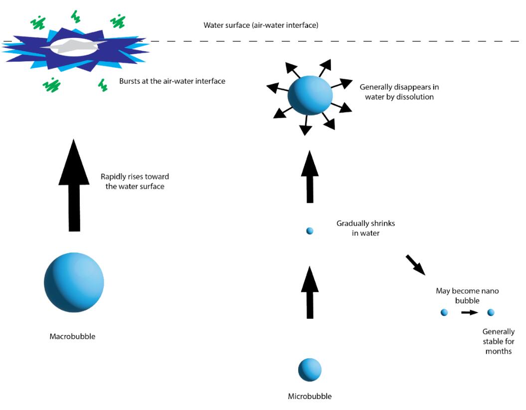 納米氣泡的定義是它們在水中的獨特性質。這些獨特的特性可能有助于將臭氧/氧氣溶解到某些水中。此外,臭氧因自然半衰期衰變而恢復為氧氣后,剩余的氧納米氣泡可能會繼續(xù)溶解在水中,并長時間氧化水中的化合物。有報道稱納米氣泡在水中停留數周。