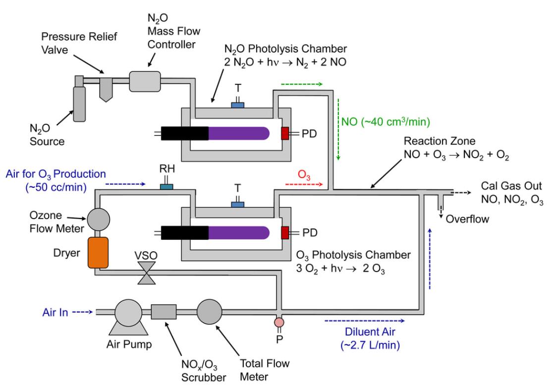 校準濃度的 O 3是通過光解凈化的環(huán)境空氣中的氧氣產(chǎn)生的,校準濃度的 NO 是通過使用一氧化二氮 (N 2 O )光解的技術產(chǎn)生的。