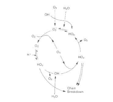 溶解的臭氧的穩(wěn)定性容易受pH,紫外線,臭氧濃度和自由基清除劑濃度的影響。在過量自由基清除劑存在下測量的分解速率(脂族和芳族)可以防止二次反應,這是通過偽一級動力學表示的。臭氧分解在鏈過程中發(fā)生,其可以由下面的圖1中所示的反應表示(基于Staehelin等人,Tomiyasu等人的兩個 很重要的模型),包括引發(fā)步驟,傳播步驟和鏈式反應步驟的中斷。 。