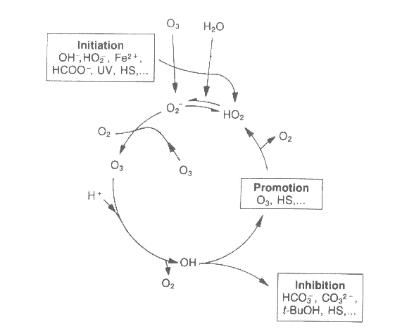 自由基反應的引發(fā)劑是能夠從臭氧分子誘導形成超氧離子O2的那些化合物。這些是無機化合物(羥基離子OH-,氫過氧化物離子HO2 - 和一些陽離子),有機化合物(乙醛酸,甲酸,腐殖質......)和253.7 nm的紫外線輻射。